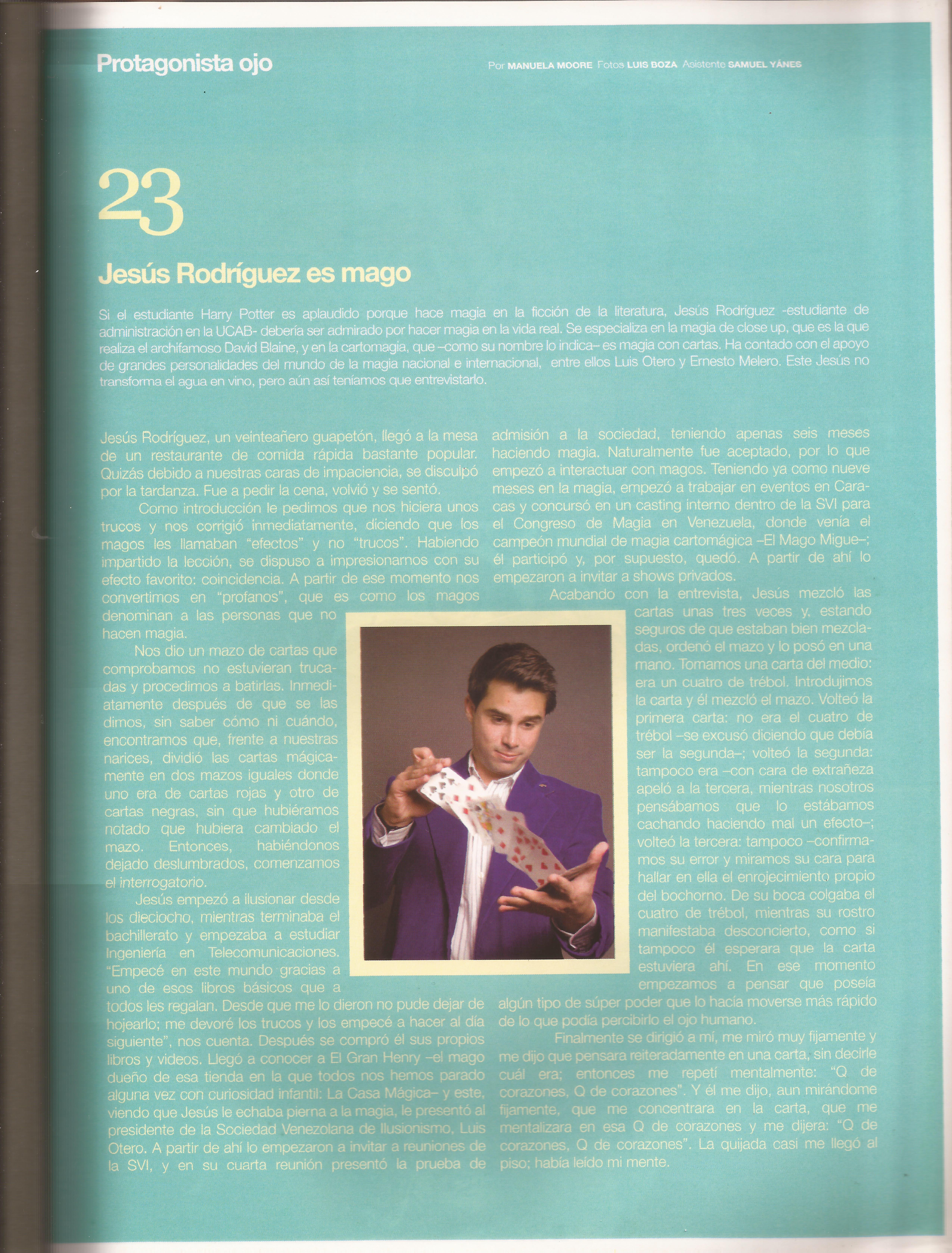 Si el estudiante Harry Potter es aplaudido por hacer magia en la ficción, Jesús Rodríguez –estudiante de Administración de la UCAB– debería ser admirado por hacer magia en la vida real. Se especializa en magia de close up, que es la que realiza el archifamoso David Blaine, y en la cartomagia que –como su nombre lo indica– es magia con cartas. Ha contado con el apoyo de grandes personalidades del mundo de la magia nacional e internacional, entre ellos Luis Otero y Ernesto Melero. Este Jesús no transforma el agua en vino, pero aún así teníamos que entrevistarlo.