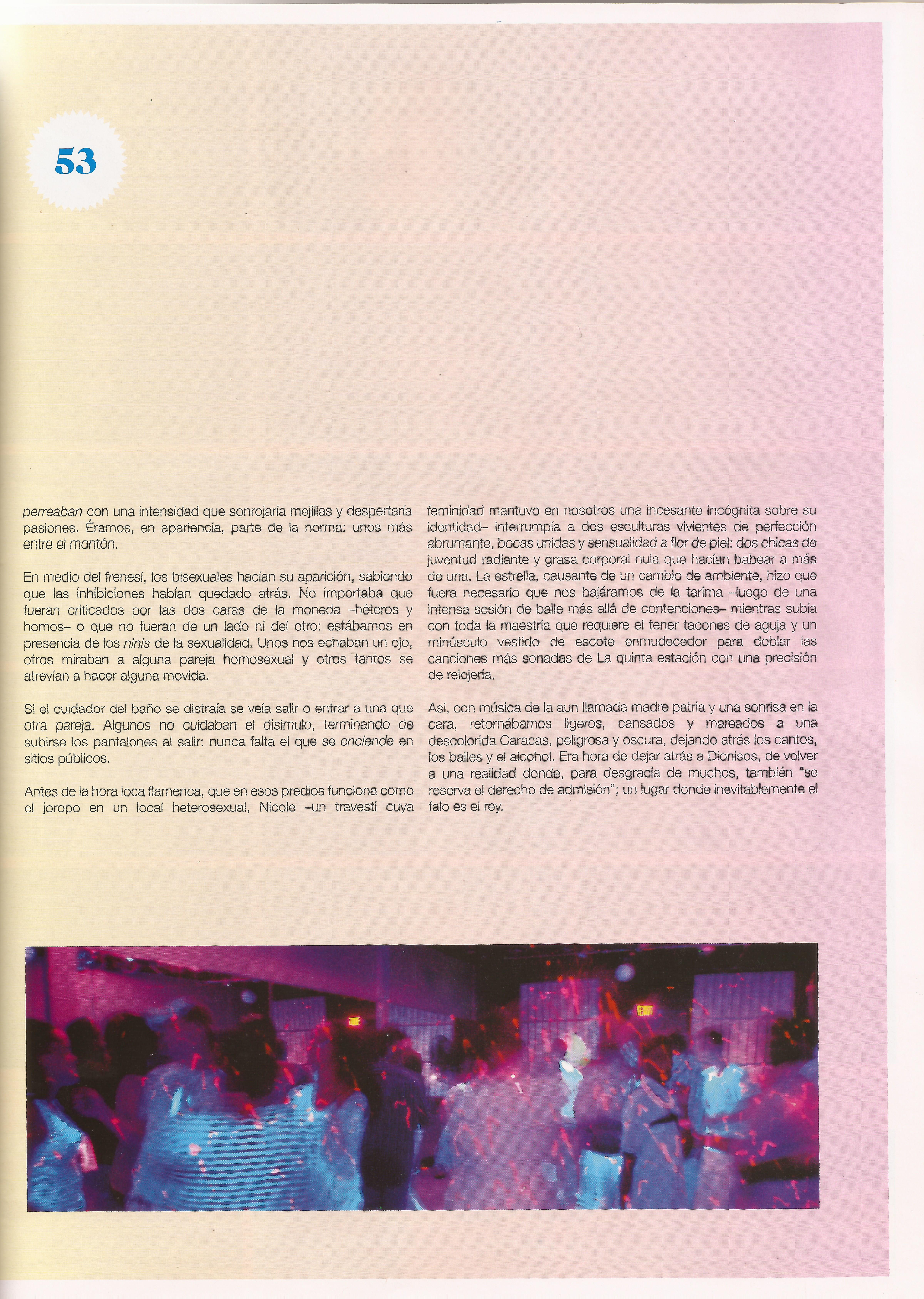 Antes de la hora loca flamenca, que en esos predios funciona como el joropo en un local heterosexual, Nicole –un travesti cuya feminidad mantuvo en nosotros una incesante incógnita sobre su identidad– interrumpía a dos esculturas vivientes de perfección abrumante, bocas unidas y sensualidad a flor de piel: dos chicas de juventud radiante y grasa corporal nula que hacían babear a más de una. La estrella, causante de un cambio de ambiente, hizo que fuera necesario que nos bajáramos de la tarima –luego de una intensa sesión de baile más allá de contenciones– mientras subía con toda la maestría que requiere el tener tacones de aguja y un minúsculo vestido de escote enmudecedor para doblar las canciones más sonadas de La quinta estación con una precisión de relojería.